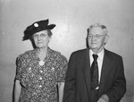John M. Moore will celebrates his 90th birthday, Tuesday at First Christian Church of Arlington. He is one of Tarrant County's oldest pioneers and recalls when Fort Worth, Texas was a small cattle town. He moved to Texas in 1861 from Cole County, Missouri at the age of eight. He is standing against a wall next to his wife, Mrs. Moore. She is wearing a hat and a floral button-up dress. Mr. Moore is dressed in a pinstripe suit.