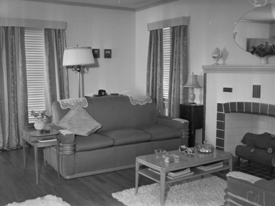 Fort Worth Star-Telegram Home Show; Leland, Cy, Jr.; Leland, Cy, Jr. (Mrs.); Living rooms; Lamps; Sofas; Rugs; Fireplaces; Mantels; Mirrors; Windows; Draperies