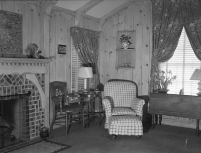 Fort Worth Star-Telegram Home Show; Canning, A. B.; Canning, A. B. (Mrs.); Windows; Draperies; Chairs; Fireplaces; Mantels; Maps; Lamps; Plants; Living rooms