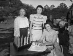 Members of the Beta Daleth Delphian sorority chapter are signing their charter. They are, left to right, Mrs. J. O. Montrief, Mrs. W. Rice McDonald, and Mrs. Robert Ward. The meeting is being held at the home of Mrs. W. S. Ourlee. Mrs. Montrief is the membership advisor. She is dressed in a lacy shirt and a skirt. Mrs. McDonald, corresponding secretary, is wearing a necklace and a polka-dot dress. Mrs. Ward is the vice president. She is wearing a floral dress. Other women are sitting in lawn chairs in the background.