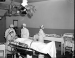 Harmon General Hospital. First Lieutenant Estella M. Guilliams naesthetizes a patient while Mrs. B. W. Adams, left, standing, and Mrs. Lucille Ford, center, standing, and Second Lieutenant Jean O. Green.