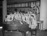 Royal Air Force (R. A. F.) cadets at Service Men's Center. Left to right, Frank Staley of Mansfield, England; Tom Rice of Bournemouth; Colin Millward of Brimsby, Jock Bell of Invergordon, Scotland; Ted Morris of Cardiff, Wales, Lee hurst of London; Tom Legg of Selborne and Reg Gilbert of Birmingham, England.