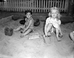 Thomas Place Nursery School. Left is Diana Knagge and at right is Charlotte Penn, playing in sand pile.