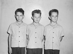 Boy Scouts. Left to right; Robert, Royce and Richard Sitton.Clipping: Triplets Join Boy Scouts. Troop 88 of the Boy Scouts gained three new members when the 12 year old triplet sons of Mr. and Mrs. W.F. Sitton, 3008 Murphy, decided to join. Amon Carter Riverside High School students, they are, left to right, Robert, Royce, and Richard Sitton. Published evening edition, August 12, 1943. Photograph showing three, twelve year old triplet brothers. They boys are all dressed identical in matching lighted colored, button up shirts and dark pants.