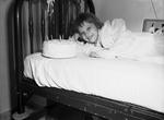 Marguerite Clarke, polio patient, shown with her birthday cake. Marguerite is lying in a bed, wearing a nightgown. Beside her head is the birthday cake. In the background, far right, a drawing of a dog can be seen (partially obscured).