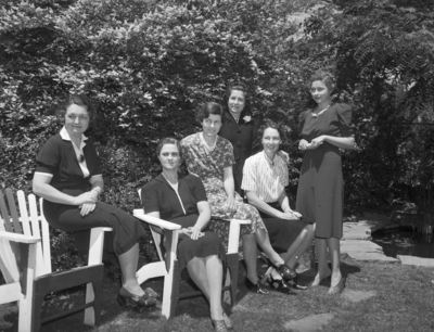 Members of the executive committee of the North Fort Worth Garden Club are planning the Spring Flower Show. The officers of the club, left to right, are Mrs. Oliver Shannon, Mrs. H. V. Helbing, Mrs. Dave McGee, Mrs. C. S. Bigham, Mrs. J. R. Switzer, and Mrs. George Crowley. Mrs. Shannon is dressed in a collared blouse and a skirt. Mrs. Helbing is sitting on an Adirondack Chair. She is wearing a blouse with a zipper along the front and a skirt. Mrs. McGee is wearing a floral dress. Mrs. Bigham is dressed in a blazer with a flower pinned to the lapel. Mrs. Switzer is dressed in a striped blouse and a skirt. Mrs. Crowley is wearing a dark colored dress.
