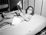 Infantile paralysis convalescent (polio), unidentified child reads get well cards while laying in bed, 08/02/1943