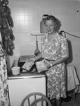 Mrs. E. E. Bryson of Saginaw, Texas, shown with freezing unit, is holding a package of peas in one hand and peaches in the other hand. Mrs. Bryson is wearing a two-toned dress with a leaf design and dark belt. There's a collection of gourds and pine cones hanging on the wall to the right of the freezer. The freezer stands at hip height and has a small square door that opens back onto the other half of the top. When Mrs. E. E. Bryson of Saginaw wants some of the vegetables she grew in her garden last Spring, she goes to her freezing unit rather than to her cupboard. Mrs. Bryson is freezing instead of canning most of the produce from her garden, in an ice cream freezer she obtained for the purpose. Although it is not a large unit she is able to freeze an amazing amount of food such as peas, beans, tomatoes, Elberta peaches (now selling for $7 a bushel), chickens and butter, which Mrs. Bryson makes in an electric churn. Mrs. Bryson uses the freezer for ice cream, too. It is peach ice cream, and very good. I know, because I had some. Published in the Fort Worth Star-Telegram morning edition, August 29, 1943.
