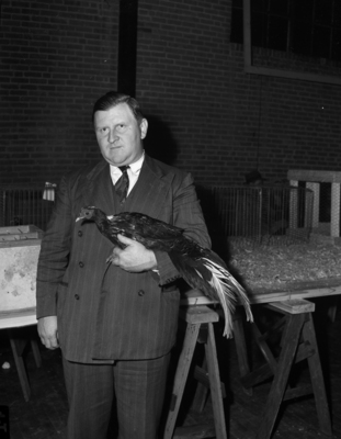 Leroy Black is turning his entire backyard over to raising chickens and pheasants. He is shown holding his brightly colored Swinhoe pheasant. According to the Fort Worth Bantam and Game Breeders Club, the bird is the only one of its breed in this part of the state. Mr. Black is dressed in a double breasted pinstripe suit. His chicken coop is in the background.