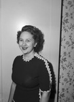 Pictured here is Miss Christianne Behnke, who with her mother, Mrs. Arno Behnke, and her sister, Mary Hope, have gone to live in Yorktown, Virginia. They will join their father/husband, Lieutenant Behnke, who is stationed there with the Navy. She is seen standing in front a wall wearing a dark garment with embroidered seams, bow earrings, curled hair, and lipstick.