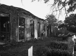 A fire raged through the Colonial Country Club early Friday. The stately columns at the front of the club house remained standing after the white frame structure was swept away by the $100,000 fire. The east and central portions of the building were left in ruins. The extent of the damage was in the north wing. The white paneling is charred and the windows are shattered. The roof collapsed in some places and is caving in others. There's a fireman in front of the building carrying a rolled-up hose.