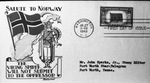 Cachet of first-day cover for new 5-cent commemorative paying tribute to Norway's resistance to Nazi domination. Designed by Dorothy Knapp and issued by Fleetwood Cover Service. At the bottom of the cachet is a scroll upon which is written "The Viking Spirit will not Submit to the Oppressor. Above the scroll is a drawing of a male Viking along with an outline of Norway. Behind the outline is the flag of Norway. This photograph was published in the August 7, 1943 morning edition of the Star-Telegram.