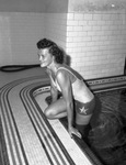 Jane Dillard, swimmer, seen climbing out the pool in her bathing suit.