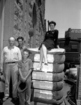 Tarrant County first bale of cotton of 1943. Miss Lorena Richardson of the Well Machinery and Supply Company, perched atop the bale of cotton. Standing, left to right, R. J. Steagall, Denton Road, owner of farm; Bill Ford, tenant, and his brother, Pete.