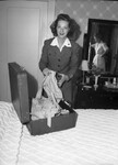 Mrs. Jane Weir Philips, home after 18 months overseas with the American Red Cross. Mrs. Phillips was attached to a Clubmobile Unit and sent to Huntington, where fro six months the unit served members of the 8th Air Force. Philips is shown unpacking her luggage placed atop a bed. Published in The Fort Worth Star-Telegram Evening Edition August 9, 1945