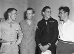 These four former Lena Pope Home boys are enjoying a reunion in Fort Worth. Left to right, Staff Sergeant Roy L. Fielder, Walter Richey, Coxswain Lowell P. Hannah, who has seen action with the Navy in the Pacific theater, and and Bill Keller, who is back to enlist through his draft board. They are standing next to each other engaged in a happy conversation. Published in the Fort Worth Star-Telegram evening edition, August 16, 1943.