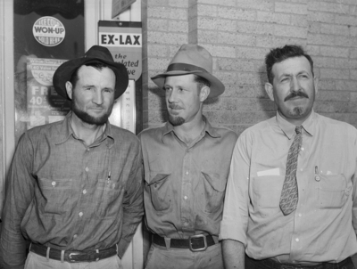 Helping to advertise and arrange the Matador Roundup and Rodeo are, left to right, A. M. Harmon, Cecil Shelton and C. E. Parks. The rodeo will take place on May 17 and 18. Mr. Harmon is wearing a long-sleeve button-up shirt, trousers, a belt and a cowboy hat. Mr. Shelton is wearing a long-sleeve button-up shirt, trousers, a belt and a cowboy hat. Mr. Parks is wearing a long-sleeve button-up shirt, trousers, a belt and a necktie. The three men are standing in front of a wall. On the wall are advertisements for various products, including Ex-Lax.