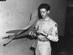 Technical Sergeant Raymond Matthews of the Fort Worth Army Air Base, with a model plane.