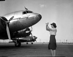 Mrs. Robert Hackney is one of three women operations agents employed by American Airlines. While an airplane is taxiing onto the runway at Fort Worth Municipal Airport, Mrs. Hackney is crossing her arms in an "X" position. The signal tells the pilot to cut the engines. Mrs. Hackney is dressed in a hat, short-sleeve blouse, and a skirt.