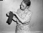 Mrs. Joe Powers looking at the shoe of a Jap sniper.