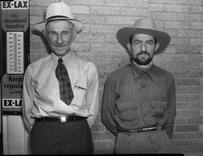 Helping to advertise and arrange the Matador Roundup and Rodeo are, left to right, Mayor George T. Edwards and Hart Harris. The rodeo will take place on May 17 and 18. Mayor Edwards is wearing a long-sleeve button-up shirt, trousers, a belt, a necktie and a cowboy hat. Mr. Harris is wearing a long-sleeve button-up shirt, trousers, a belt, a cowboy hat and a bandanna wrapped around his neck. The two men are standing in front of a brick wall. On the wall is an advertisement for Ex-Lax.