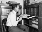 J. M. Williams is an auditor for Tarrant County, Texas. He completed the 1944 budget for the county this week and sent it to the State Comptroller in Austin, Texas. Despite a ten-percent rise in county salaries and generally rising costs, the budget showed a $25,000 reduction in operating costs. In addition to setting the annual budget, Mr. Williams is responsible for bookkeeping and checking the legality of every dime spent by the county. He is shown sitting by a bookcase,, reading a book. He is wearing a dress shirt, necktie, and trousers.