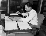 J. M. Williams is an auditor for Tarrant County, Texas. He completed the 1944 budget for the county this week and sent it to the State Comptroller in Austin, Texas. Despite a ten-percent rise in county salaries and generally rising costs, the budget showed a $25,000 reduction in operating costs. In addition to setting the annual budget, Mr. Williams is responsible for bookkeeping and checking the legality of every dime spent by the county. He is shown sitting at a desk, looking over the books. He is wearing a dress shirt, necktie, and trousers.