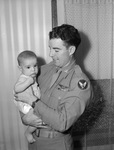 Lieutenant John L. Van Dyke is enjoying meeting his five-month-old son, John Lee Junior for the first time. Lieutenant Van Dyke is a bombardier in the United States Army Air Corps. He has been stationed in Hawaii since October. While in the Pacific Theater, he received the Air Medal and Oak Leaf Cluster. The lieutenant is a former composing room employee of the Fort Worth Star-Telegram. He is dressed in his military uniform. John Junior is in his father's arms, dressed in a jumper.