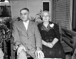 Mr. and Mrs. W. H. Anderson are celebrating their 53rd wedding anniversary. The couple was married on August 27, 1890. They are shown sitting and relaxing on a porch swing. Mr. Anderson is wearing a dress shirt, blazer, and trousers. Mrs. Anderson is wearing a dark dress with a pearl necklace and a corsage. There is a bicycle on the porch, next to Mr. Anderson.