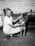 A robber who has broken into multiple homes in Rendon, Texas, during the last week has been given the moniker the "Bigfoot Burglar." Mrs. I. N. Stephenson is demonstrating the close call with Bigfoot at her home. Her dog, "Rascal," fled into the house when the intruder threw a clod at him. Mrs. Stephenson is kneeling next to Rascal. She is wearing a floral dress. Along with six other men, Mrs. Stephenson's husband has organized a posse to find the burglar.