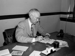 Albert Clifton Farmer, 70 year old who started as a messenger boy 56 years ago and today figuratively writes "30" to 29 years of service as city superintendent of the Western Union office here will put on his hat Tuesday and retire. Farmer has seen many happenings in his half century of service. He has has seen the grim news of battle casualties and the great news of battle victories flash from the telegraph wires over the Spanish-American War, World War I and World War II. Mr. Farmer is shown sitting at a desk signing a document with an ink quill. Published in the Fort Worth Star-Telegram evening edition, August 31, 1943.