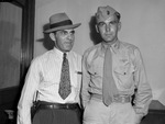 A marine flier from Denton, Texas, is visiting his brother in Fort Worth, Texas. Pictured, left to right, are City Detective Herman Shifflett and Captain Edwin Shifflett. Detective Shifflett received an honorable discharge from the United States Army on June 16, 1943. Upon discharge, he returned to the Fort Worth Police Department, where he is a detective. He is dressed in a hat, pinstripe shirt, necktie, and trousers. His firearm is holstered at his hip. Captain Shifflett is a pilot in the United States Marine Corps. In 1940 he left North Texas State Teachers College a year early to enlist in the military. He is visiting his brother while on 34-day leave. Captain Shifflett is dressed in his military uniform.