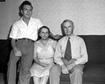 The Oxford family spent some time in Japan as missionaries. Sitting on a couch, left to right, are Wayne Oxford, Mrs. J. S. Oxford, and Mr. J. S. Oxford. Wayne is 18 years old and plans to enter the Army as an interpreter. He is dressed in a short-sleeve shirt and trousers. Mrs. Oxford is wearing a button-up dress. Mr. Oxford is dressed in a button-up shirt, necktie, and trousers.