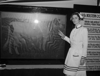The Panhandle Plains exhibition included both dairy cattle and dairy products and attracted crowds from wide areas of the Plains country. Mrs. Lee Wortham, of Plainview, Texas, was in charge of the Holstein cow exhibit. She is shown standing next to the exhibit, pointing to a large-scale picture of Carnation Ormsby, world champion milk and butterfat producer. Beside the picture is a poster with a list facts about Holstein cows. Mrs. Wortham is wearing a long-sleeve dress and eyeglasses.