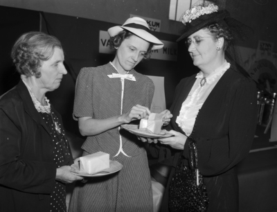Plainview, Texas, held its 13th annual Panhandle Plains Dairy Show. The exhibition included both dairy cattle and dairy products and attracted crowds from wide areas of the Plains country. Examining some of the dairy products on display are three women who helped to organize the show. They are, left to right, Mrs. J. D. Clayton, Miss Lucille Shultz, and Mrs. W. H. Messick. Mrs. Clayton is exhibition chairman of Wayside Club in Hale County. She is wearing a polka-dot dress and a blazer. Miss Shultz is a Hale County home demonstration agent. She is wearing a striped blazer and matching skirt and a hat. Mrs. Messick is exhibition chairman of the Snyder Club in Hale County. She is wearing a blouse, skirt, coat and a hat. She is holding a handbag.