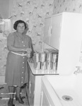 This is the story of a farm family that struggled along for years without getting anywhere and then, with the establishment of a workable farm plan and help from the Government, is worth five times what it was years ago. In this picture is Mrs. Dave Wilson, farmer's wife, is in the kitchen stacking cans on a table for her canning program. She is wearing a button down dress. Published in Fort Worth Star-Telegram, morning edition, September 12, 1943.