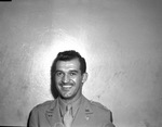 Captain Edgar J. Wynn is the assistant air inspector at the Fort Worth Army Air Field. He is attending the Retail Merchants Association luncheon at the Worth Hotel. While in the Royal Air Force (R. A. F.), Captain Wynn made 44 Atlantic crossings in two years. He and a small team ferried bombers from Montreal, Canada, to England. The 29-year-old pilot has been flying since he was 16 years old. He grew up in Boston, Massachusetts, and only recently moved to Fort Worth, Texas. Captain Wynn is shown standing against a wall, dressed in a military uniform.
