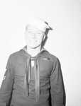 Bill Luck Mercer, gunner's mate, second class who went into the Navy from Polytechnic High School. In the photograph, Mr. Mercer is wearing his uniform and a hat. He is standing in front of a bare wall and smiling.