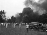 Smoke from burning wreckage of one of two B-24 Liberator bombers which collided in midair over Birdville and crashed to earth about two miles northeast. This plane broke in two and dropped into a brush-filled creek bed. The other dived into a wheat field a mile away. There is a crowd of people standing in a field, most of them looking at smoke billowing in the background. There is also an ambulance in the foreground. Published in the Fort Worth Star-Telegram evening edition, September 3, 1943.