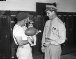 Captain Melville Ehlers is home on leave from the Army Air Forces, where he serves as a pilot. He is proudly introducing his son, Melville Junior, to his former coach, Dutch Meyer. Coach Meyer (left) has been the head coach of the Texas Christian University Horned Frogs for the past nine seasons. Captain Ehlers was an end on Meyer's 1938 championship team. Coach Meyer is dressed in a hat, t-shirt, and trousers. He is fitting a football in Mel Jr.'s hands. Captain Ehlers is dressed in his military uniform. There are lockers opened in the background.