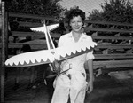 Mrs. V. W. Russell is the winner of first place in the Class A endurance contest for gasoline-powered model planes. The statewide meet was held at Cobb and Sycamore Parks. Mrs. Russell is shown holding her winning model plane. She is dressed in coveralls and standing in front of bleachers.