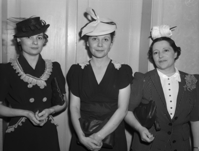 Plainview, Texas, held its 13th annual Panhandle Plains Dairy Show. The exhibition included both dairy cattle and dairy products and attracted crowds from wide areas of the Plains country. Standing against a wall are three women who helped organize the show. They are, left to right, Mrs. C. W. Churchwell, chairman of the registration committee of the show; Mrs. H. V. Tull Junior, general chairman; and Mrs. Virgil Winn, chairman of the escort committee. Mrs. Churchwell is wearing a dark colored dress with ruffle detailing along the neckline and a hat. Mrs. Tull is wearing a dark colored dress with lace details on the shoulders and a hat. Mrs. Winn is wearing a blouse and a striped blazer with a matching skirt. All three women are holding purses.