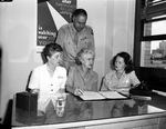 Meeting to discuss the Army Emergency Relief, left to right, are Mrs. S. Rains Wallace, Mrs. J. Huntington Hills, Mrs. Ralph W. Hodges, and Colonel J. Huntington Hills (standing). The Army Emergency Relief office is located on the fourth floor of the Texas & Pacific Passenger Building. Colonel Hills is dressed in a military uniform. Mrs. Wallace is wearing a white button-up blouse with a handkerchief in the pocket. Mrs. Hills is wearing a collared blouse and is shown making notes in a binder. Mrs. Hodges is wearing a striped blouse. The women are sitting at a desk. On the desk is a telephone. Colonel Hills is standing behind them.