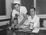War Bond Drive. Clyde Bailey, baker, buying bond from A. R. Collins, the company's bond representative. Clyde is bending over Collins desk signing a bond, as Collins sits behind the desk. Published in Fort Worth Star-Telegram, evening edition. September 8, 1943.