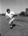Corky Groce is the tailback on the Paschal High School football team. The star Panther sustained a hampering injury and will be unable to start in the upcoming game against Amon Carter Riverside. Despite the injury, Groce will be brought in when the Panthers are in scoring territory. He is shown demonstrating a stiff arm during practice. He is dressed in a practice uniform and a helmet.