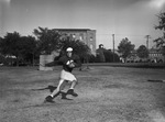 Football North Texas Agricultural College. Pete Scout in posed action shot. Last fall, one of the greatest freshman gridders ever at Texas Christian University, struts his stuff at the North Texas Agricultural College. He is on the field holding the football in his left hand. Published in the Fort Worth Star-Telegram Morning September 12, 1943.