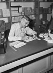 John M. Jones of 4129, East Lancaster, manager of Tyler and Simpson Wholesale Grocery Company. Like other typical American taxpayers, he has been busy figuring his declaration on income received, victory taxes deductions, withholding taxes held out of salary and other factors. In this picture, he is sitting behind a desk writing on a piece of paper with some box supplies behind him. Published in Fort Worth Star-Telegram, evening edition, September 10, 1943.