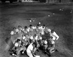 The Masonic Home High School football team is preparing for the upcoming 1943 season. Pictured left to right, on the back row, are Dan Jordan, Bob Miller, Grant Finnigan, Bob Hogan, Wallace Plankhurst, Macyl Thornton, Hugh Musslewhite, and J. C. King. On the front row are Fred Land, Douglas Lord, Gene Roberts, C. L. Wilkie, Jack Sharkey, Gene Riddle, and Coach Charles Romine. The players are dressed in their football uniforms. They are huddling around the coach as he details a play.