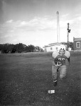 The Masonic Home High School football team is preparing for the upcoming 1943 season. They have a light, small squad but are also fast, aggressive, and smart. They are looking to battle teams all the way to the District Seven AA championship. One of the star Mighty Mites is Grant Finnigan, quarterback. He is an all-around ball player and a smart field general. Grant is a strong passer and will handle some of the punting duties. He is shown running the ball during practice, dressed in a number 48 uniform.
