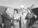 War Bond Loan Drive. J. Lewell Lafferty shaking hands with William Boyd. Looking on are Mrs. Boyd (Grace Bradley) right, and Mary Brian. These movie stars came in a transport plane, and are standing outside greeting Lafferty. Published in Fort Worth Star-Telegram, evening edition, September 9, 1943.